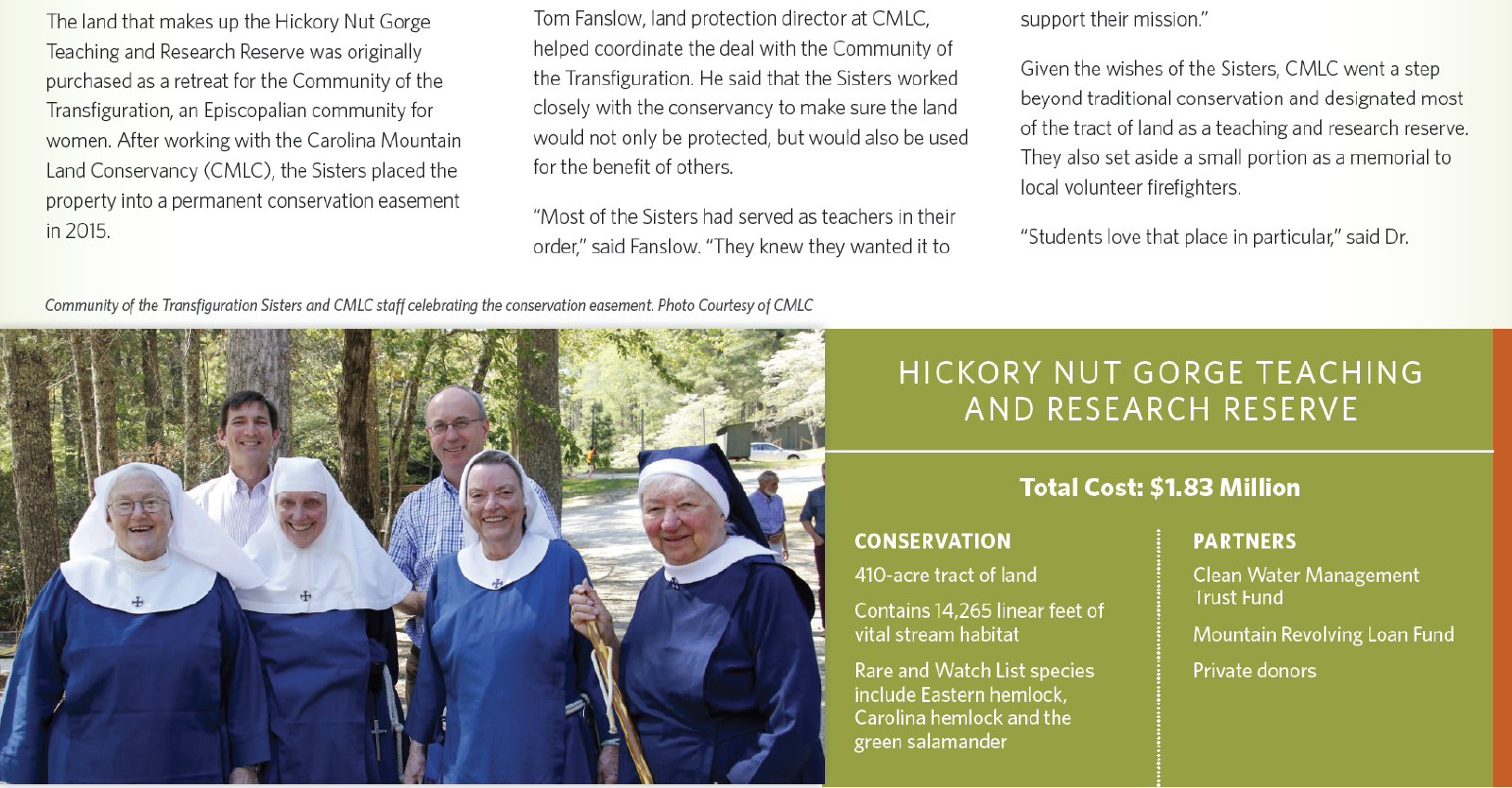 Nuns from Cincinnati, devoted to helping working mothers in the inner city, played a vital role in helping conserve nearly 400 acres of land deep in Bat Cave, North Carolina. Taking a step beyond traditional conservation, and following in the Sisters’ vision, their land today is used to teach.